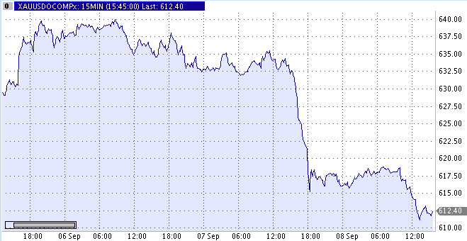 Цены на золото рухнули, потеряв за последние двое суток $ 30 за тройскую унцию в связи с ростом курса доллара. Пори этом наблюдатели уверяют, что снижение может продолжиться по техническим причинам: прорыв месячного минимума в $606.80 за унцию, установленного на прошлой неделе, спровоцирует дальнейшие продажи по стоп-приказам. Однако дилеры говорят, что на уровне $600 может появится физический спрос. "Я не вижу долгосрочного спроса со стороны инвесторов, напротив, на рынке много горячих денег", - сказал Саймон Викс из ScotiaMocatta в интервью Reuters. "Определенно, они (фонды) попытаются создать бычье настроение на рынке в четвертом квартале, но когда вокруг столько металла, трудно понять, как они это сделают". Серебро стоит $12,25/12,30 за унцию против $12,56/12,63 в Нью-Йорке. Платина подешевела до $1.238/1.243 с $1.250/1.255 за унцию, палладий стоит $338/343 за унцию против $341/346 на американском рынке.