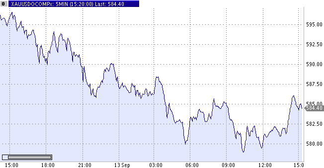 Золото продолжило снижение в среду, опустившись на 1,6 процента до 11-недельного минимума, в ходе волатильных торгов на фоне падения цен на нефть и вследствие технической распродажи, говорят аналитики. Другие драгоценные металлы следуют за золотом: серебро достигло минимальной отметки с 26 июля, платина достигла минимума двух месяцев, палладий потерял пять процентов. "С учетом такого резкого падения вещи выглядят в целом мрачно. Учитывая, что мы начали сентябрь на такой позитивной ноте, очень грустно видеть, что золото торгуется на таких уровнях", - сказал Дэвид Холмс, директор по продажам драгметаллов в Dresdner Kleinwort. "На фоне снижения цен на нефть и металлы эйфория на рынке постепенно сходит на нет. Я думаю, мы все еще находимся в стадии коррекции". В ходе торгов золото достигло $578,60 за унцию. Из-за активной распродажи фондами металл за неделю потерял в цене десять процентов. Нефть упала ниже $64 за баррель в ожидании данных о состоянии запасов нефти и нефтепродуктов в США, которые поступят в 18.30 МСК. "До тех пор, пока золото торгуется ниже отметки в $597-$600, оно будет стремиться опуститься еще ниже и протестировать отметку в $575, а может, и $550", - сказал Даррен Хиткоут из Investec Australia.