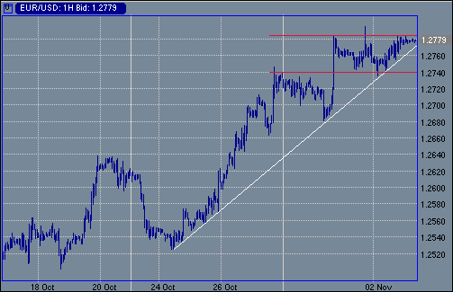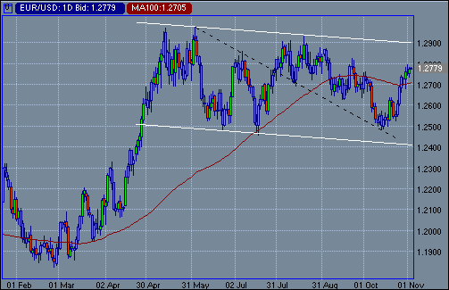 Теперь можно рассмотреть техническую картину. Традиционно в этом случае мы оцениваем курс доллара к европейской валюте. Пунктирная линия на графике дневного периода сообщает, что доллар утратил движущую силу, которая вела его нижней границе установленного диапазона, еще в середине октября. Затем 26 октября последовало пробитие 100-дневной скользящей средней линии снизу вверх, а на следующий день она прошла проверку на прочность уже в качестве поддержки. На часовом графике восходящую динамику поддерживает трендовая линия, построенная с 24 октября. В то же время можно выделить ярко выраженный прямоугольник, выступающий в роли фигуры продолжения тенденции.