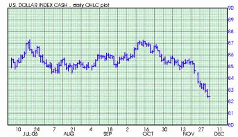 Мда? Этого вполне достаточно для подкрепления теории о раздавленной банке. Однако для того, чтобы понять, что же на самом деле демонстрирует этот график, вам следует знать, что он собой представляет. USDX - это индекс доллара США по отношению ко всем прочим основным валютам: "австралийцу", "канадцу", иене, евро, франку и фунту. Но здесь есть одна серьезная проблема. За много лет британцы и швейцарцы добились большого прогресса в деле достижения стабильности и баланса со своими европейскими противниками. Фактически, на определенном этапе эти две валюты могут последовать за французским франком, итальянской лирой, испанским песо и иже с ними, - и навсегда исчезнуть. Таким образом, возникает вопрос: почему тогда эти валюты все еще используются при расчете индекса? В конце концов, втроем они представляют 50% удельного веса индекса. Как-то это нечестно - и непрактично. Если убрать из его состава фунт и франк, то доля европейских валют в индексе сразу снизится с 50% (три из шести компонентов) до 25%. Удельный вес Европы в индексе слишком велик, учитывая, в каком тесном взаимодействии и согласии находятся все эти три валюты.