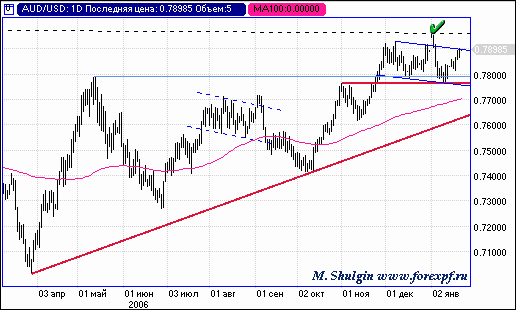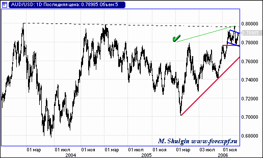 И в нашем случае мы предпочитаем ориентироваться не на линии флага, а на предыдущий минимум, т.е. дно текущего января на 0.7760. Его потеря создает фактические риски для прекращения тренда, которые будут значительно усилены в случае пробития 100-дневной скользящей средней линии. Однако последнее слово будет за линией тренда. Тем не менее, подразумевая риски укрепления доллара США, мы сохраняем позитивные представления в отношении укрепления австралийского доллара, поэтому продолжаем удерживать длинные позиции в соответствии с нашими комментариями от 29 ноября 2006 года. Михаил Шульгин ProFinance.Ru - Forex News / Новости Форекс