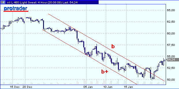 Техническую ситуацию можно определить как процесс формирования коррекции от снижения курса в канале b-b+ на рис. 2 ($63.59(21 декабря)-$49.89(18 января)).