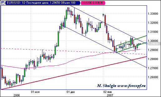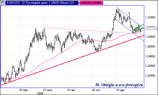 Однако развязка близка. Об этом красноречиво говорит близость ключевых технических уровней к текущему курсу, а также обилие фундаментальных факторов, которые на текущей неделе могут спровоцировать формирование тенденции. В настоящий момент, с точки зрения технического анализа, нижняя граница в паре выглядит прочнее области сопротивлений, поскольку к поддержкам добавилась 100-дневная средняя. Однако если в ближайшей перспективе евро не сможет подняться выше 1.3050, разочарование будет настолько сильным, что 100-дневная средняя уже не остановит укрепление доллара. Да и бывшее сопротивление, построенное от максимумов 5 июня 2006 года, тоже уже не будет играть никакой роли. Доллар уверенно направиться проверять на прочность среднесрочную линию тренда. Михаил Шульгин ProFinance.Ru - Forex News / Новости Форекс