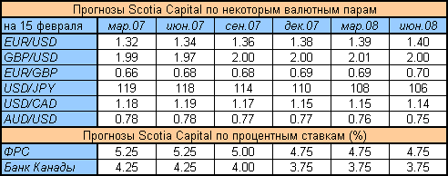 Ниже представлена таблица форекс прогнозов по валютным парам и процентным ставкам от Scotia Capital. Прогнозы составлены 15 февраля 2007 года и остаются актуальными в настоящий момент.