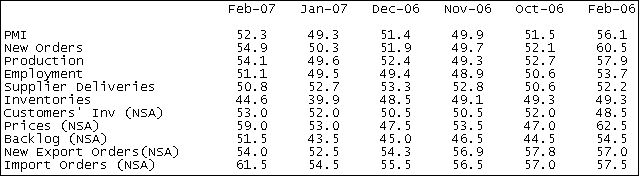 Индекс ISM в феврале вырос до 52.3 пунктов, тогда как средний прогноз экономистов составлял 49.5, а в январе индекс упал до 49.3. Индекс уплаченных цен вырос до 59.0 с 53.0 в январе, индекс новых заказов также продемонстрировал позитивную динамику и достиг 54.9, поднявшись с 49.5. Индекс занятости, тем временем, вырос до 51.1 с 49.5 ранее, а индекс запасов достиг 44.6 по сравнению с 39.9 в январе. Индексы импортных и экспортных заказов в феврале поднялись до 61.5 и 54.0 с 54.5 и 52.5 соответственно.ProFinance.Ru - Forex News / Новости Форекс