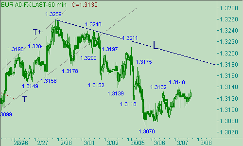 Евро/доллар незначительно изменяет свой курс, так вчерашний диапазон составил 55п., а уже сегодня пара смогла подняться только до отметки 1.3140. Тот факт, что ожидаемая коррекция от падения курса 1.3240(1/03/07)-1.3070(5/03/07) затягивается во времени нас никак не радует, так как мы предполагали обыграть этот возможный сценарий изменения курса. Затяжная коррекция льет воду на мельницу "медведей", указывая на возможность продолжения нисходящего движения с началом от 1.3240(1/03/07). В случае down-сценария отметим важные области поддержки: 1.3070/60, 1.2920/10, 1.2865.