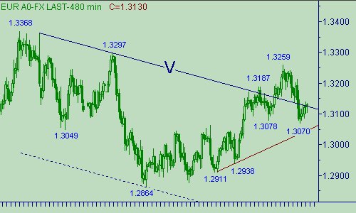 Имеются проблемы с определением текущей ситуации, но отдаем предпочтение позициям на покупку, так их возможность, в данном случае, подтверждается вспомогательными индикативными функциями на внутридневных графиках. В случае снижения курса до 1.3080 открываем позицию на покупку, стоп-лосс располагаем на уровне 1.3046, цель - 1.3188. Промежуточные целевые уровни - 1.3130, 1.3160. В случае прорыва пары выше 1.3200 будем искать возможности для открытия позиции на продажу.