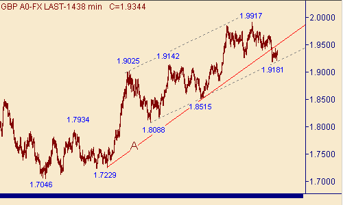 Фунт/доллар остается в интервале 1.9180-1.9430, направление прорыва пары из которого подскажет нам её текущее состояние. Так падение курса ниже 1. 9181 обозначит продолжение второй нисходящей ветки в канале R-R+ на рис. 2, а его подъем выше 1.9430 укажет на процесс коррекции от этой самой второй ветки того же канала. Для нас важным является уровень 1.9353, так как прорыв пары выше этого значения цены предполагает, что нисходящее движение с началом от 1.9432(12/03/07) не является начальным импульсом в продолжении down движения с началом от 1.9673(27/02/07). Пока котировки изменяются выше уровня 1.9181 "быки" попытаются развить свой успех в виде up-импульса 1.9181(5/03/07)-1.9432(12/03/07), который может стать основой для дальнейшего роста британской валюты. А между тем линия R на рис. 2 опустилась ещё ниже и в настоящее время проходит вблизи уровня 1.9557.
