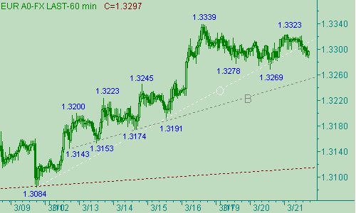 Евро/доллар опустился ниже линии O на рис. 1. На том же рисунке в запасе у пары остается линия B. В настоящее время мы озадачены следующей проблемой: можно ли считать нисходящее движение с началом от 1.3339(16/03/07) законченным или нет? Понятно, что если пара опустится ниже 1.3269 (вчерашний минимум), то можно и нужно считать, что снижение от максимума пятницы (1.3339) продолжается. "Быки" очень постарались и смогли организовать восходящее движение от вчерашнего минимума до сегодняшнего максимум (1.3269-1.3323), которое вполне может стать основанием для дальнейшего роста евро, но для этого, повторимся, необходимо сохранить курс европейкой валюты против американского доллара выше 1.3269. В настоящее время евро тестирует техническую поддержку (на графике с периодом 60 мин.) вблизи 1.3290. Если все же эти две валюты опустятся ниже отметки 1.3269, то ближайший целевой и заметный уровень поддержки рассматриваем вблизи 1.3253. Опять же все сводится к выделенной ранее области поддержки 1.3240/1.3255. Кстати вблизи этого интервала проходит линия B на рис. 1.