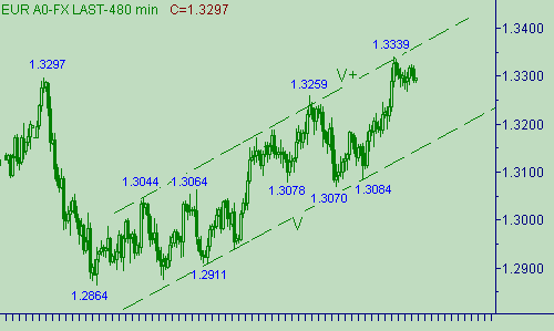 Понятно, что потенциал у восходящего движения с началом от 1.2864(12/01/07) (на рис. 2 рост пары в канале V-V+) сохраняется и будет ещё сохраняться довольно долго, пока котировки не снизятся ниже 1.2875 (грустно, но это на не опечатка) или пара задержится в интервале 1.2880-1.3339 более 7 недель.