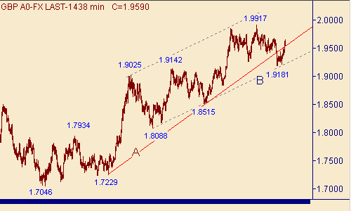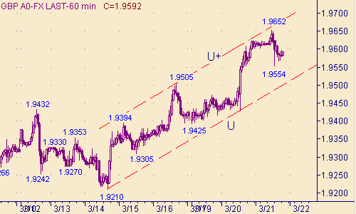Фунт/доллар порадовал нас восходящим каналом U-U+ на рис. 2, но огорчил тем, что не попал в целевую область около уровня 1.9670. Других заметных изменений не произошло. Оценка текущей ситуации остается прежней, как процесс формирования ценой коррекции от роста фунта 1.8515(11/10/06)-1.9917(23/01/07). Напомним, ранее мы рассматривали возможность того, что от 1.9181 началась вторая часть этой коррекционной формации. Велика вероятность, того, что сегодняшний максимум, равный 1.9652, соответствует окончанию этой второй части. Может ли этот рост курса (вторая часть) продолжиться? Конечно, может. Например, в случае формирования третьей восходящей ветки в этой второй части, когда первая ветка является up-движение 1.9181(5/03/07)-1.9432(12/03/07), а вторая - изменение цены в канале U-U+ на рис. 1.