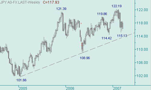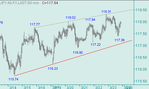 Для постановки позиции на продажу можем выделить ценовой интервал 118.80-119.10, для подобных продаж целевая область находится вблизи 117.00. В ближайшие дни будем отслеживать возможный рост курса в продолжение восходящего движения американской валюты с началом от 115.74(14/03/07), и искать возможные области окончания этого роста доллара. Так же остается актуальной и задача поиска возможности для постановки позиции на покупку.