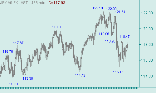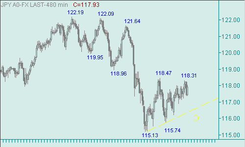 В этом году доллар/йена в феврале смогла установить в восходящем движении с началом от 101.66(янв. 05) максимум, равный 122.19. В этом движении пара обозначила две восходящие ветки: первая ветка - 101.66(янв. 05)-121.39(дек. 05); вторая ветка началась от 108.96(май 06). В свою очередь, рассматриваемая пара во второй ветки так же сформировала два up-движения: первое движение - 108.96(17/05/06)-119.86(13/10/06); второе - 114.42(5/12/06)-122.19(29/01/07). Последующее снижение курса 122.19(29/01/07)-115.13(5/03/07) можем понимать, как коррекцию от второго up-движения. Восходящее движение с началом от 115.13(5/03/07), обозначенное на рис. 2 линий O, определяем, как попытку пары сформировать третье up-движение в продолжение роста курса от 108.96(17/05/06). Уже в этой потенциальной третьей up-ветке первым восходящим движением является подъем доллара 115.13(5/03/07)-118.47(12/03/07). Далее доллар/йена от 115.74(14/03/07) формирует последующее восходящее движение, для которого важными (целевыми) областями сопротивления являются области около 118.25/35, 118.40, 118.80, 119.05/15, 119.80, 121.75. Из перечисленных интервалов и уровней наибольшую, по нашему разумению, техническую защиту имеет уровень 118.80. Прорыв курса выше него спровоцирует увеличение восходящего импульса пары.