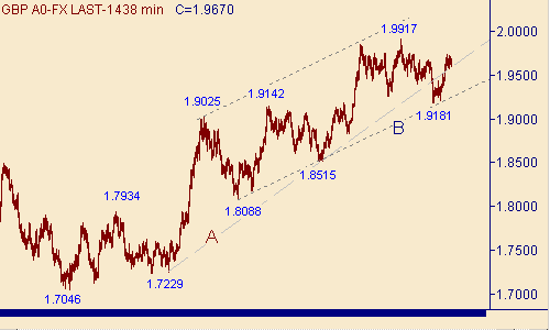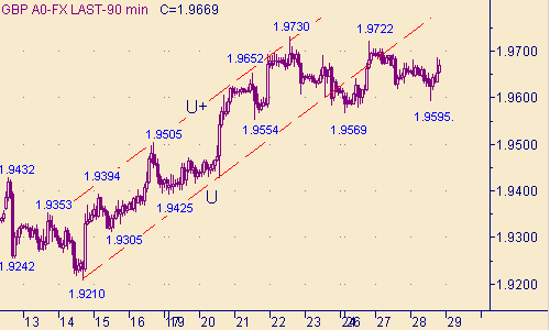 Время идет, а фунт/доллар так и не смог вновь возвратиться к уровню 1.9570. Длина нисходящего движения цены 1.9722(26/03/07)-1.9595(28/03/07) составило 78.9% от длины предыдущего снижения курса 1.9730(22/03/07)-1.9569(26/03/07), но никак не 100%. Поэтому можем предполагать, что потенциал коррекции пары от её роста 1.9392(19/03/07)-1.9730(22/03/07) исчерпан, и рассматриваемой паре необходимо определяться со своими дальнейшими намерениями. Вариантов всего два. Первый вариант предполагает коррекционные движения цены, но уже от восходящего движения фунта 1.9210(14/03/07)- 1.9730(22/03/07) (движение в канале U-U+ на рис. 2), с перспективами плавного перехода в коррекционную формацию от up-движения британской валюты 1.8515(11/10/06)-1.9917(23/01/07). Второй - продолжение роста пары с началом от 1.9181(05/03/07).