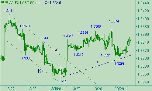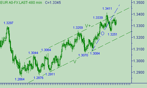 Восходящее движение евро/доллара с началом от 1.3251(26/03/07) можно считать завершенным, его вчерашний взлет 1.3321-1.3374 является процессом достижения технической цели и частью коррекции от роста пары 1.3251(26/03/07)-1.3368(28/03/07). Отметим, что в этой модели коррекционный максимум оказался выше максимума самого восходящего движения. Общая величина восходящей ветки 1.3251(26/03/07)-1.3374(28/03/07) равна 123п. Сегодняшний коррекционный минимум достиг отметки 1.3299, и сейчас евро/доллар пытается сформировать очередное восходящее движение, целевую область которого рассматриваем около 1.3420/25. На сегодня техническим сигналом, указывающим на процесс продолжения up-тренда, будем считать прорыв курса выше 1.3430. Если формулировать на языке "веток", то сейчас пара пытается сформировать вторую восходящую ветку с началом от 1.3299 в up-движении с началом от 1.3251(26/03/07). При этом техническим сигналом подтверждающим, что рост курса является очередным up-трендом, а не просто частью коррекции от подъема евро вдоль линии O на рис. 2, будет или расширение (удлинение) второй ветки, т.е. взлет котировок выше 1.3430 , или формирование уже третьей восходящей ветки в движении от 1.3251(26/03/07). А пока актуальность коррекционной модели от восходящего движения европейской валюты вдоль линии O на рис. 2 никто не отменял.