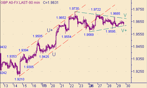 Диапазон нисходящих и восходящих движений фунт/доллара уменьшается, что на рис. 1 показано линиями V и V+. Поэтому предполагаем, что пара продолжает процесс формирования коррекции от своего роста в пределах восходящего канала U-U+ на рис. 1. В случае нисходящего прорыва из области, находящейся между линиями V-V+ на рис. 2, целевые уровни рассматриваем вблизи 1.9560, 1.9515, 1.9470, 1.9405, 1.9310. Восходящий сценарий привлечет наше внимание к интервалам около 1.9830, 1.9880, 1.9965.