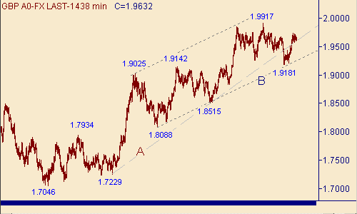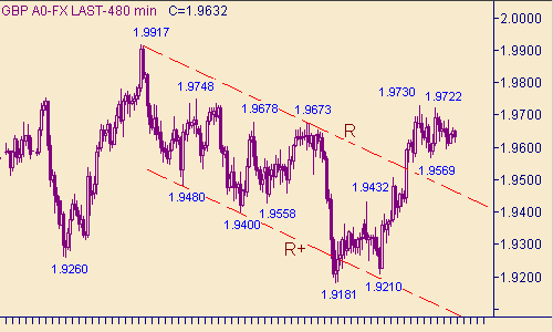Считаем, что на сегодня более актуален коррекционный сценарий. Направление движение пары будем определять по направлению прорыва цены из интервала 1.9560-1.9730. Падение фунта ниже 1.9560 укажет на процесс формирования третьей части коррекционной формации от роста фунт/доллара 1.8515(11/10/06)-1.9917(23/01/07), когда down-канал R-R+ на рис. 2 является первой частью этой коррекции. В свою очередь подъем британской валюты выше 1.9730 будет предполагать продолжение её восходящего движения с началом от 1.8515(11/10/06)-1.9917(23/01/07). Ближайшая удобная область для открытия позиции находится вблизи уровня 1.9560 (покупки).
