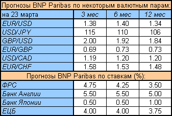 Ниже представлена таблица прогнозов форекс по валютным парам от BNP Paribas. Прогнозы составлены 23 марта 2007 года и остаются актуальными в настоящий момент.