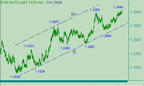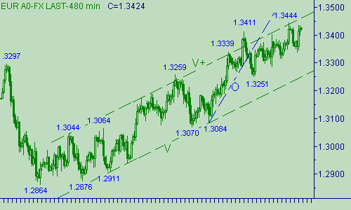 Сегодняшний трехчасовой (с 4:00 мск. до 7:00мск.) взлет евро остановился около уровня 1.3434. Перед этим пара смогла установить промежуточный минимум 1.3339. Хорошо, что "смогла", а не хорошо - этот минимум расположен ниже минимума 04/05/07, равного 1.3350, поэтому можем считать, что восходящее движение 1.3317(03/04/07)-1.3444(05/03/07) завершилось. Следовательно, up-движение евро с началом от 1.3339(09/04/07) будем рассматривать или как очередную восходящую ветку в канале D-D+ на рис. 1 или уже как первую часть коррекционной формации роста цены в том же канале. Участники рынка то же призадумались над выбором из этих двух альтернативных вариантов и евро/доллар с 7:00 мск. честным образом тестирует уровень 1.3434. Для восходящего движения курса перспективными целевыми областями являются ценовые интервалы: 1.3480/90 и 1.3525/35.