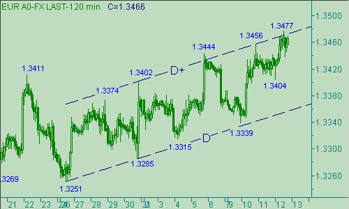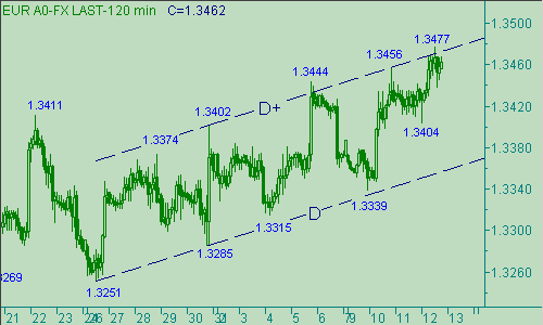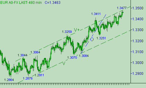 Сегодня евро/доллар смог приблизиться к технической целевой области 1.3480/1.3500, оставив отметку на уровне 1.3477. На рис. 1, 2 и 3 видим, что пока сохраняются перспективы для продолжения каналов D-D+, V-V+, R-R+. Сразу перечисляем другие технические целевые области для up-движения пары: 1.3480/1.3500, 1.3512/25, 1.3570/85. На текущий момент актуальным вопросом является вопрос о законченности или не законченности последнего (с началом от 1.3339(09/04/07)) восходящего движения в канале D-D+ на рис. 1. Техническим сигналом, подтверждающим окончание этого роста курса, будет прорыв евро ниже уровня 1.3399.