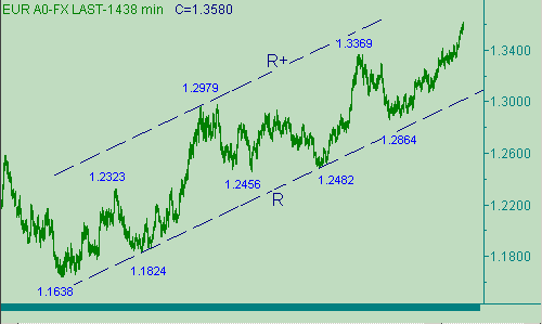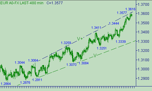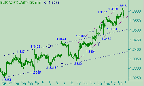 Состоялся локальный прорыв евро/доллара выше фигуры 1.3600, когда пара установила промежуточный максимум вблизи 1.3616, и сейчас она пытается сформировать коррекцию от своего восходящего движения между вчерашним минимумом (1.3523) и сегодняшним максимумом (1.3616). Ближайшие цели для этой коррекции: 1.3577, 1.3560, 1.3530. Подъем евро выше упомянутой фигуры является хорошей предпосылкой для продолжения роста курса в канале Y-Y+ на рис. 1. Повторим вчерашние целевые области, с небольшими дополнениями, для случая продолжения роста европейской валюты в пределах этого канала: 1.3615/20, 1.3630, 1.3660, 1.3705, 1.3725/35, 1.3780/90. Первая область из этого списка сегодня уже была достигнута рассматриваемой парой, а значит её жизнь в этом канале прожита не зря. Заметным техническим down-сигналом будет падение котировок ниже значения 1.3520, что укажет на возможность снижения евро/доллара к ценовому интервалу 1.3360-1.3400.