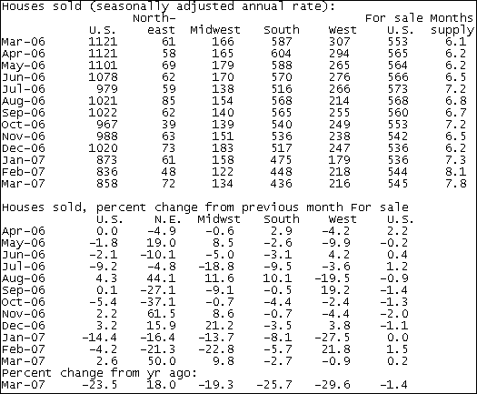 Продажи новых домов в марте выросли лишь на 2.6% до 858 000, что оказалось хуже прогнозов экономистов в 890 000, тогда как негативным был и пересмотр данных за февраль (с 848 000 до 836 000) и за январь (с 882 000 до 873 000). Средняя цена продаж, однако, поднялась на 0.9% до $254 000 (+6.4% г/г). Рост продаж новых домов наблюдался на северо-востоке США (+50.0%) и на среднем западе (+9.8%), в то время как на юге и западе они упали на 2.7% и 0.9% соответственно. ProFinance.Ru - Forex News / Новости Форекс
