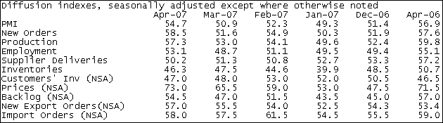 Индекс ISM в обрабатывающей промышленности превзошел ожидания экономистов, прогнозировавших умеренное увеличение индекса до 51 пункта по сравнению с 50.9 в марте, и в апреле составил 54.7 пункта, при этом индекс новых заказов вырос до 58.5 пункта с 51.6 месяцем ранее, а индекс уплаченных цен увеличился до 73.0 с 65.5. Тем временем, индекс производства вырос до 57.3 с 53.0 в марте, индекс занятости - с 48.7 до 53.1, а индекс запасов сократился до 46.3 с 47.5. Индексы новых экспортных и импортных заказов в апреле составили 57.0 и 58.0 соответственно по сравнению с 55.5 и 57.5 ранее. ProFinance.Ru - Forex News / Новости Форекс