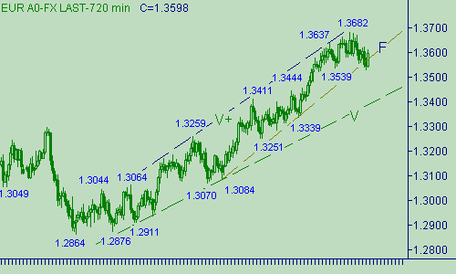 Текущий рост пары от сегодняшнего минимума (1.3532) рассматриваем как вторую часть коррекционной формации, а, следовательно, в ближайшее время мы будем заняты поиском возможного окончания (как по временной так и по ценовой координатным осям) этой второй части. Альтернативный взгляд на сегодняшний подъем котировок: участники рынка пытаются спровоцировать продолжение восходящего движения вдоль линии V на рис. 2 (рост от 1.3070(05/03/07)).