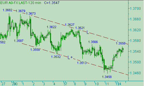 Из возможных потенциальных позиций можем предложить следующую: в случае теста парой уровня 1.3560 открывать позиции на продажу со стоп-лоссом на уровне 1.3587. Проблемой этой позиции является "размазанность" целевой области. Позиция ставится в предположении down-отката от первой восходящей части коррекции евро/доллара (коррекция от падения в канале L-L+ на рис. 1). А вот окончание этого локального down-отката находится в интервале 1.3530-1.3460. Поэтому в этом случае цель определяем около уровня 1.3460, а стоп-лосс подтягивается в случае достижения парой отметок 1.3530, 1.3505, 1.3575. Мы сами, после продолжительных раздумий, эту позицию пропускаем, в том числе из-за проблем с целевой областью. Наши дальнейшие торговые планы связаны все с той же рабочей моделью: в случае продолжения u-движения курса (прорыв выше 1.3570) ищем возможности для постановки позиции на продажу, а при развитии down-движения ищем подтверждений для открытия позиций на покупку.