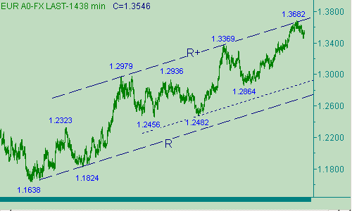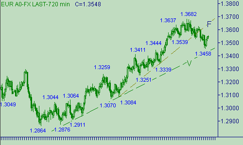 Теперь о возможных дальнейших перспективах евро/доллара. Два варианта. Первый: евро пытается продолжить свое нисходящее движение, обозначенное на рис. 1 каналом L-L+. Пока продолжение down-движения мы будем относить к процессу формирования парой коррекции от её роста вдоль линии F на рис. 2. Таким образом, по первому варианту, европейская и американская валюты могут продолжить down-коррекцию от своего подъема 1.3070(05/03/07)-1.3682(27/04/07). Техническим сигналом, указывающим на продолжение нисходящего движения евро/доллара в канале L-L+ на рис. 1 будем считать прорыв курса ниже 1.3450. Второй вариант: рассматриваемая пара продолжает формировать коррекцию от своего снижения в нисходящем канале L-L+ на рис. 1. который мы рассматриваем как первую часть коррекции от подъема курса вдоль все той же линии F на рис. 2. В этом случае канал L-L+ на рис. 1 будем считать как первую часть этой коррекции. В качестве рабочего варианта выбираем второй вариант.