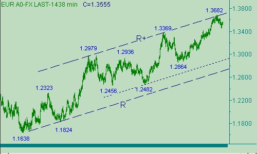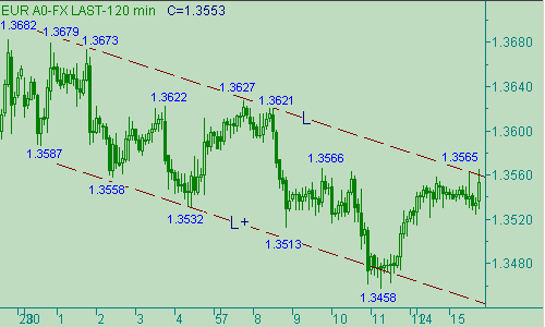 Графики евро/доллара не претерпели заметных изменений. Пара не решилась на судьбоностные прорывы, оставаясь как в пределах нисходящего канала L-L+ на рис. 1, протестировав линию L, так и в ценовом интервале 1.3450-1.3570. Краткое содержание вчерашнего коммента: прорыв евро ниже уровня 1.3450 укажет на процесс продолжения его нисходящего движения, очерченного линиями L и L+ на рис. 1, а подъем цены выше уровня 1.3570 будет предполагать, что европейская и американская валюты формируют коррекционную формацию от своего падения между L и L+, которую мы рассматриваем как вторую часть коррекции от роста котировок вдоль линии F на рис. 2. Следовательно, ценовой интервал 1.3450-1.3570 можно рассматривать как нейтральную территория между расположением армий "быков" и "медведей". Важных изменений на графиках евро/доллар не произошло, а следовательно мы остаемся верны выбранной рабочей модели: модель формирования парой коррекции от своего роста вдоль линии F на рис. 2.