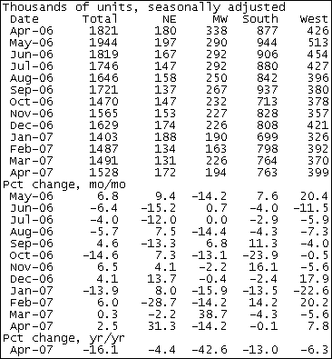 Начала строительств в апреле продемонстрировали рост на 2.5% до 1.528 млн., таким образом оказавшись выше прогнозов экономистов в 1.475 млн. Вместе с тем, позитив от этих цифр несколько смягчил пересмотр данных за предыдущие два месяца: с 1.518 млн. до 1.491 млн. в марте и с 1.506 млн. до 1.487 млн. в феврале. Помимо этого отрицательную динамику продемонстрировали и разрешения на строительство, которые в апреле упали на 8.9% до 1.429 млн. Основной прирост был зафиксирован в северо-восточной части США, где начала строительств выросли на 31.3%, также рост был отмечен на западе страны (+7.8%), в то время как снижение наблюдалось на юге и среднем западе: -0.1% и -14.2% соответственно. ProFinance.Ru - Forex News / Новости Форекс