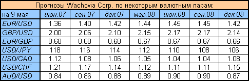 Ниже представлена таблица прогнозов по валютным парам от Wachovia Corp. Прогнозы составлены 9 мая 2007 года и остаются актуальными в настоящий момент.