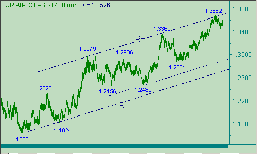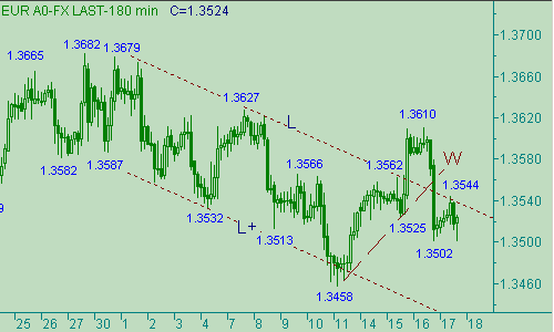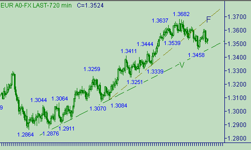 Восходящее движение евро/доллара вдоль линии W на рис. 1 является полноценной коррекцией от его снижения 1.3627(07/05/07)-1.3458(11/05/07). Дальнейшие возможные перспективы пары: продолжать формирование коррекционной формации от падения курса в нисходящем канале L-L+ на рис. 1, в которой подъем евро с началом от 1.3458(11/05/07) является первой частью этой формации; пытаться обозначить продолжение нисходящего движения с началом от 1.3682(27/04/07), которое мы рассматриваем как коррекцию от укрепления европейской валюты 1.3070(22/02/07)-1.3682(27/04/07) (рост цены вдоль линии F на рис. 2) с целевой областью 1.3330-1.3370. Пока курс остается выше 1.3450, мы выбираем для работы первый из перечисленных вариантов.