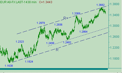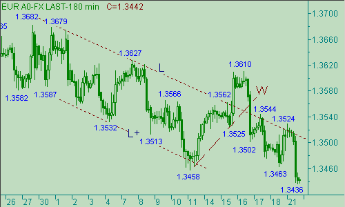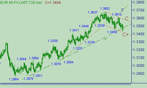 Сегодня евро/доллар временно опускался ниже уровня 1.3440, установив промежуточный минимум, равный 1.3436. Пара обозначает границы нисходящего канала C-C+ на рис. 1. В этом канале евро формирует вторую down-ветку: первая down-ветка 1.3682(27/04/07)-1.3458(11/05/07); вторая ветка началась от 1.3610(16/05/07). Ближайшие целевые области для снижения курса в этом канале расположены около уровней 1.3435, 1.3380, 1.3320, 1.3280, 1.3235. И уже в который раз повторяем, что в качестве рабочей модели выбираем модель формирование парой коррекционную формацию от её роста вдоль линии F на рис. 2. Сильным "бычьим" сигналом будем считать прорыв курса выше 1.3530.