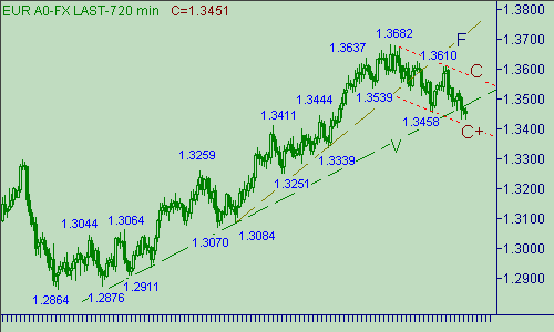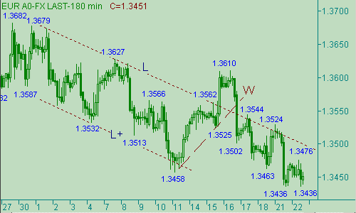 Заметных изменений не произошло. Пара оставалась между вчерашним и сегодняшним минимумами (1.3436), и сегодняшним промежуточным максимумом (1.3476). Понятно, что участники рынка смогут спровоцировать новый down-импульс только прорывом курса ниже 1.3436. В этом случае мы ожидаем от "быков" попытку остановить падение евро в канале C-C+ на рис. 2 уже около уровня 1.3380. В свою очередь выше текущей цены в качестве важной области сопротивления отмечаем область 1.3490/1.3505, подъем европейской валюты выше этого интервала оживит настроение в стане "быков", но эта радость может продлиться не долго, так как совсем рядом находится следующая, не менее важная, область сопротивления, расположенная между 1.3560-1.3570. Кстати, на рис. 2 линия C проходит вблизи уровня 1.3582. По-хорошему значительным up-сигналом можно считать прорыв пары выше уровня 1.3610, от которого началась вторая down-ветка в канале C-C+ на рис. 2. Однако этот возможный рост цены выше отметки 1.3610 мы не будем рассматривать как сигнал к пересмотру наших взглядов на текущую ситуацию, которую по-прежнему считаем как процесс формирования евро/долларом коррекционную формацию от его роста вдоль линии F на рис. 2. Пересматривать рабочую модель мы будем только в случае, если котировки превысят значение 1.3700.