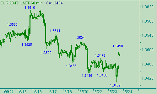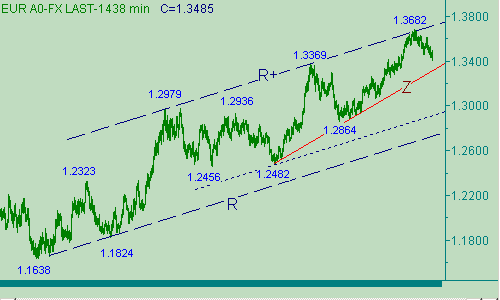 Евро/доллар честно тюкнулся о линию C+ на рис. 2, и сейчас пара обозначает коррекцию от второй down-ветки в канале C-C+: первая down-ветка - 1.3682(27/04/07)-1.3458(11/05/07); вторая - 1.3610(16/05/07)-1.3409(23/05/07). В качестве цели для указанной выше коррекции можно рассматривать на рис. 2 линию C, в настоящее время эта линия проходит вблизи уровня 1.3578. Но перед этой линией находится другая приметная область сопротивления - 1.3500/10. Сейчас евро/доллар с упоением тестирует нижнюю границу этой области, установив промежуточный максимум вблизи 1.3498.