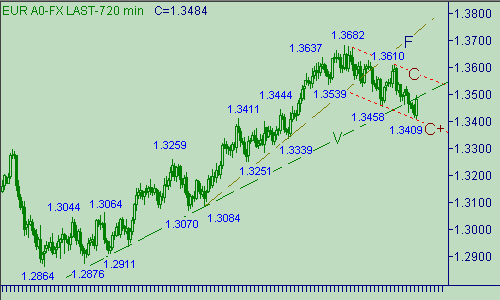 Какие дальнейшие перспективы у этой пары? Пока курс остается ниже фигуры 1.3700, мы будет рассматривать в качестве рабочей модели, используемой для постановки позиции, модель формирования ценой коррекционную формацию от её подъема вдоль линии F на рис. 2. Как возможный вариант - коррекция евро от его роста вдоль линии V на рис. 2. В случае подъема пары выше линии C на рис. 2 будем считать её рост с началом от сегодняшнего минимума, равного 1.3509, как вторую часть коррекционной формации, в которой первой частью является канал C-C+ на рис. 2. На сегодня считаем целью этой коррекционной формации область 1.3300/30. Прорыв евро/доллара выше фигуры 1.3700 укажет нам на то, что он продолжает свой up-тренд, например, обозначенный на рис. 1 линией Z.