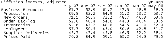 Индекс Чикаго PMI в мае вырос до 61.7 пункта, оказавшись сильнее прогноза в 54 пункта и поднявшись по сравнению с 52.9 в апреле. Составляющие компоненты показателя также выглядели позитивно, принимая во внимание рост индекса новых заказов до 71.1 с 56.5 пункта в апреле, рост индекса уплаченных цен, который в мае составил 70.2 по сравнению с 64.9 ранее, а также увеличение индексов производства и занятости, поднявшихся соответственно до 69.8 и 57.3 с 62.2 и 50.5. Индекс запасов, между тем, также оказался выше апрельского значения (43.2) и составил 52.6 пункта. ProFinance.Ru - Forex News / Новости Форекс