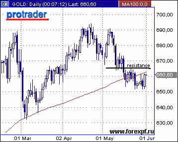 Золото в четверг торговалось с более позитивным настроем, принимая во внимание некоторое ослабление американской валюты и возобновление роста рынка акций в Китае. Драгоценный металл, после неудачных попыток преодолеть поддержку в области $652/650, сегодня продемонстрировало восходящее движение, в результате чего максимум на споте был установлен около $661.70, и в настоящее время держится около $660.50. Августовский фьючерс на COMEX, тем временем, достиг отметки $666.80, в то время как аналогичный контракт на CBOT поднялся к $667.50. Рынок по-прежнему остается неустойчивым, и оптимизм инвесторов несколько поутих, после того как продажи центральными банками золота усилили нынешнее его снижение. Сам факт продаж не является новым и необычным, однако он оказывает влияние на настроения на рынке, что уже проявилось в снижении объемов золота в распоряжении ETF - по данным на 30 мая, общий объем запасов металла этих фондов снизился на 1.4% по сравнению с предыдущим днем, составив 625.09 тонн. "Я не вижу причин на данный момент, которые заставили бы меня открыть лонг", - заявляет Майкл Уилдмер из Calyon Corporate and Investment Bank. Золото остается ниже 100-дневной скользящей средней недалеко от $662.50, и, для того чтобы приглушить медвежий настрой ему необходимо подняться выше, тогда как уверенный прорыв выше $665 за тройскую унцию поддержит надежды на возобновление восходящего движения. Между тем, потеря поддержи в районе $650 будет предполагать дальнейшее снижение в направлении 200-дневной скользящей средней. ProFinance.Ru - Forex News / Новости Форекс