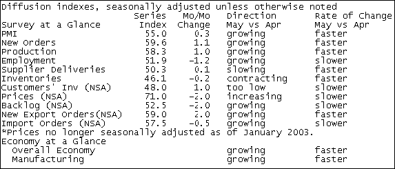 Индекс ISM в обрабатывающей промышленности в мае вырос до 55 пунктов по сравнению с 54.7 пункта в апреле и средним прогнозом в 54, однако компоненты индекса выглядят не столь позитивно, как общий показатель. В частности, индекс уплаченных цен упал до 71.0 пункта с 73.0 ранее, а индекс занятости составил 51.9 по сравнению 53.1 в апреле. Между тем, индекс новых заказов продемонстрировал позитивную динамику, поднявшись до 59.6 пункта с 58.5 ранее, индекс новых экспортных запасов вырос до 59.0 с 57.0, в то время как индекс импортных заказов сократился до 57.5 с 58.0. Индекс запасов в мае составил 46.1 по сравнению с 46.3 в апреле, индекс производства вырос до 58.3 пункта с 57.3. ProFinance.Ru - Forex News / Новости Форекс