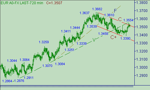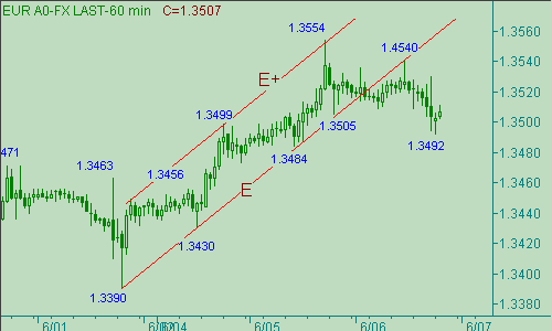 Внимательно смотрим на рис. 2 и видим, что евро/доллар смог временно прорваться выше линии C и это хорошо для "быков", но свеча с периодом 720мин. так и не смогла закрыться выше этой линии - хорошо для "медведей". Непримиримые противники разошлись гордо подняв голову и оставшись при своем мнении. Текущую ситуацию определяем как процесс формирования парой коррекции от роста курса в восходящем канале E-E+ на рис. 1. Перспективные целевые области для этой down-коррекции рассматриваем около уровней 1.3490 и 1.3440. Вблизи этих уровней ожидаем активизации "быков" с намерением продолжить восходящее движение цены с началом от 1.3390(01/06/07), используя up-ветку пары 1.3390(01/06/07)-1.3554(05/05/07) как начальный восходящий импульс. В случае развития восходящего движения европейской валюты на текущий момент рассматриваем в качестве целевых областей для укрепления евро области около 1.3600 и 1.3650. При этом down-разворот евро/доллара от первого уровня предполагает продолжение его снижения с началом от 1.3682(27/04/07), а во втором - попытку сформировать третью часть в коррекции с началом от 1.3682(27/04/07), в которой первой частью является падение курса в канале C-C+ на рис. 2, а вторая часть - началась от 1.3390(01/06/07).