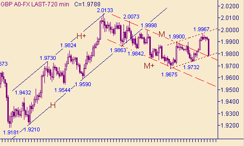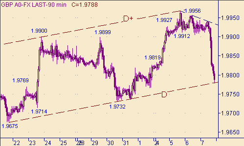 Фунт/доллар так и не смог закрепиться выше фигуры 1.9900, тем самым, продолжая свой рост во второй up-ветки канала D-D+ на рис. 1. Линия D на рис. 1 проходит сегодня вблизи уровня 1.9779. Архиважной задачей "быков" является не допустить падение курса ниже уровня 1.9732. Пока фунт находится выше этой отметки, сохраняются перспективы для продолжения его восходящего движения, обозначенного на рис. 1 каналом D-D+. Ниже, около 1.9670, отмечен следующий критериальный уровень, и падение котировок ниже этого значения укажет на перспективы нисходящего движения фунт/доллара до области 1.9520/1.9500 (положение линии B на рис. 3 - уровень 1.9516). В свою очередь, уже упомянутые ранее "быки" имеют хороший шанс для предотвращения подобного снижения двух валют в случае, если они смогут спровоцировать up-отскок фунта от области вблизи 1.9670. В этом случае продолжится процесс формирования британской валютой коррекции от её ослабления в канале M-M+ на рис. 2, с неплохими перспективами перехода этой коррекции в продолжение восходящего движения вдоль линии B на рис. 3.