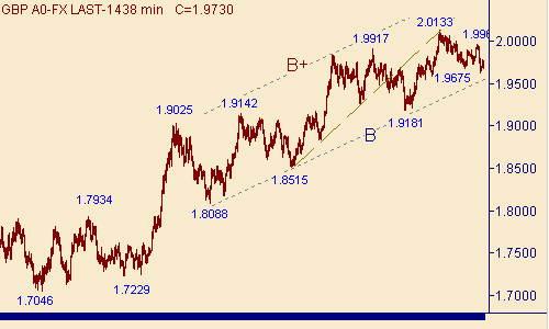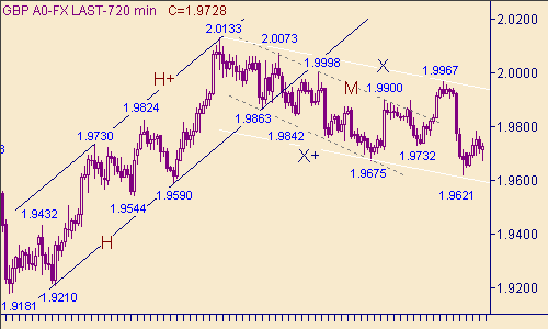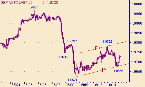 У пары фунт/доллар нисходящий канал X-X+ на рис. 2 имеет следующую структуру: первая down-ветка - 2.133(18/04/07)-1.9675(21/05/07); вторая началась от 1.9967(05/06/07). Отметим, что равенство длин этих двух down-веток находится вблизи отметке 1.9509. А пока вторая down-ветка представляет из себя нисходящее движение британской валюты 1.9967(05/06/07)-1.9621(08/06/07). Предполагаем, что от локального минимума 1.9621(08/06/07) фунт пытается организовать коррекцию от этого снижения котировок, что обозначено на рис. 1 up каналом P-P+. Целевая область этой коррекции - ценовой интервал 1.9820-1.9860. Ближайшие перспективы "быков" и "медведей" связаны с каналом X-X+ на рис. 2, так как вторые будут пытаться продолжить снижение фунта в этом канале, а первые - обозначить окончание этого движения, пытаясь спровоцировать рост цены выше уровня 1.9967.