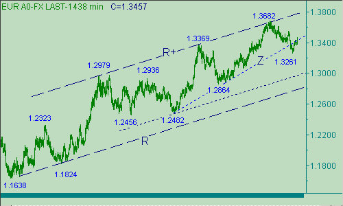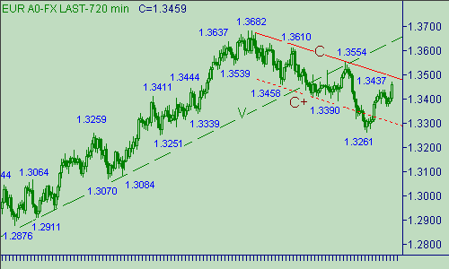 Евро/доллар продолжает свое восходящее движение с началом от 1.3261(13/06/07). Пара пытается прорваться и закрепиться выше уровня 1.3450, установив промежуточный максимум 1.3468. Целевая область этого подъема евро расположена между 1.3540/60. Мы уже писали про важность прорыва курса выше уровня 1.3554 (начало второй down-ветки в канале C-C+ на рис. 2). Сам нисходящий канал C-C+ рассматриваем как часть коррекции евро/доллара (или сама коррекция) от его роста 1.2864(12/01/07)-1.3682(27/04/07). Поэтому в случае подъема цены выше 1.3554 "быки" будут пытаться развить восходящий импульс, намереваясь продолжить up-движение европейской валюты с началом от 1.2456(19/07/06). А надежды "медведей" будут связаны с возможностью формирования парой очередной нисходящей ветки в коррекционной формации с началом от 1.3682(27/04/07). В случае положительного для косолапых продолжения эта ветка будет второй частью в этой формации. Понятно, что указанная выше возможная нисходящая ветка может начаться от любого уровня ценового интервала 1.3554-1.3700.