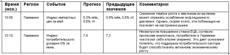 06.10 Германия Индекс настроений потребителей, рассчитываемый компанией Gfk, за июль 8.0 7.3 12.30 США Индекс национальной деловой активности ФРС-Чикаго за май -0.10 14.00 США Продажи на вторичном рынке жилья за май +0.2% -2.6% 14.30 США Индекс деловой активности в обрабатывающей промышленности ФРС-Даллас за июнь 25.0 23.50 Япония Индекс цен на услуги для компаний за май +1.1% г/г Великобритания Годовой отчет Банка Англии Германия Полугодовой отчет Ifo, посвященный экономическим перспективам Германии и мира на текущий исследующий год 09:45 Andy 17: Народ просыпается. Скоро с вестями от Большого Будуна подтянутся ))