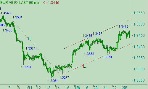 Если пытаться впрыгнуть в несущийся от 1.3261(13/06/07) up-паровоз, то это лучше сделать от области 1.3415/00 со стоп-лоссом, расположенным ниже 1.3390 и целью - 1.3540. Можно попробовать это сделать, но мы не будем открывать покупки, так как считаем, что в настоящее время более перспективна модель коррекции от роста евро вдоль линии L на рис. 1. Техническая цель этой возможной коррекции находится вблизи уровня 1.3330. Но так как не смогли открыть позицию от области около отметки 1.3470, то и сегодня воздержимся от этого. Надеемся, что рынок день-два проживет и без нашего непосредственного участия. В случае роста цены до уровня 1.3545 будем открывать позицию на продажу с целью на уровне 1.3340, стоп-лосс - 1.3587.