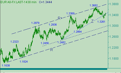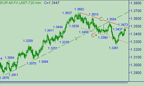 Последний торговый день закрылся вблизи уровня 1.3465, что можно считать сигналом скорее "бычьим", чем "медвежьим". Так же отметим, что уже второй день пара тестирует область вокруг отметки 1.3470 (максимум пятницы равен 1.3468, сегодняшний промежуточный максимум - 1.3473), около которой расположен уровень Фибоначчи 50% от снижения евро 1.3682(27/04/07)-1.3261(13/06/07). В настоящее время евро/доллар обозначает down-отскок от этой области с угрозой теста ценового интервала 1.3400-1.3415. Развитие нисходящего движения грозит "быкам" перспективой падения котировок ниже значения 1.3370, что обозначит нам окончание восходящего движения цены вдоль линии L на рис. 1 и предоставит "медведям" шанс продолжить нисходящее движение европейской валюты в канале C-C+ на рис. 2 с целевой областью, отмеченной на уровне 1.3070 (промежуточные уровни поддержки 1.3370, 1.3270). Понятно, что для уверенного снижения курса ему необходимо опуститься ниже 1.3260, а для его убедительного роста - подняться выше 1.3555. В последнем случае up-прорыв двух валют имеет критериальное значение, так как укажет, что восходящее движение евро/доллара с началом от 1.3261(13/06/07) является вовсе не коррекцией от второй down-ветки канала C-C+ на рис. 2 (ветка - 1.3554(05/06/07)-1.3261(13/06/07), а как минимум коррекционной формации от снижения в самом этом канале, а как максимум - начальный up-импульс в продолжении восходящего движения цены с началом от 1.2456(19/07/06)).