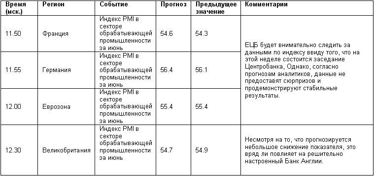12:30 Великобритания Июнь PMI manufacturing 55 18:00 США Июнь ISM Manufacuring 55 55 21:00 - США - Treasury's to sell 3m bills ($15bn) and 6m bills ($14bn) 09:55 DVT: фунт достиг первой цели... пойдем за второй?