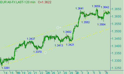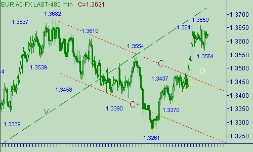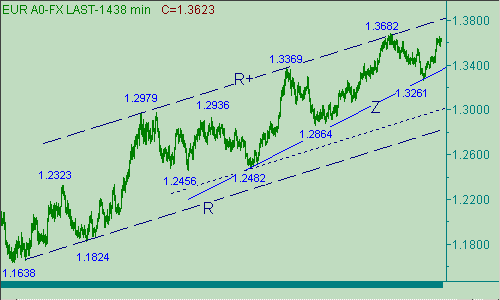 В пятницу евро/доллар смог закрыть свой торговый день на уровне 1.3623, что является максимумом цены закрытия дня с 1 мая. Но пока пара так и не смогла подняться выше отметки 1.3660, а тем более - выше 1.3700. Отметим, что в ценовом исчислении ближайшая задача "быков" выглядит значительно легче, чем у противной стороны. Так для первых необходим убедительный прорыв курса выше фигуры", когда как для "медведей" требуется снижение котировок ниже значения 1.3413. Первый указанный прорыв будет предполагать процесс продолжения восходящих движений евро/доллара вдоль линий O на рис. 1 и 2 и Z на рис. 2 с целевыми областями, расположенными вблизи уровней 1.3657, 1.3715, 1.3810, а второй - окончание восходящего движения вдоль линии O на рис. 1 и 2, когда down-коррекция может распространиться до уровней 1.3505, 1.3400, 1.3333.